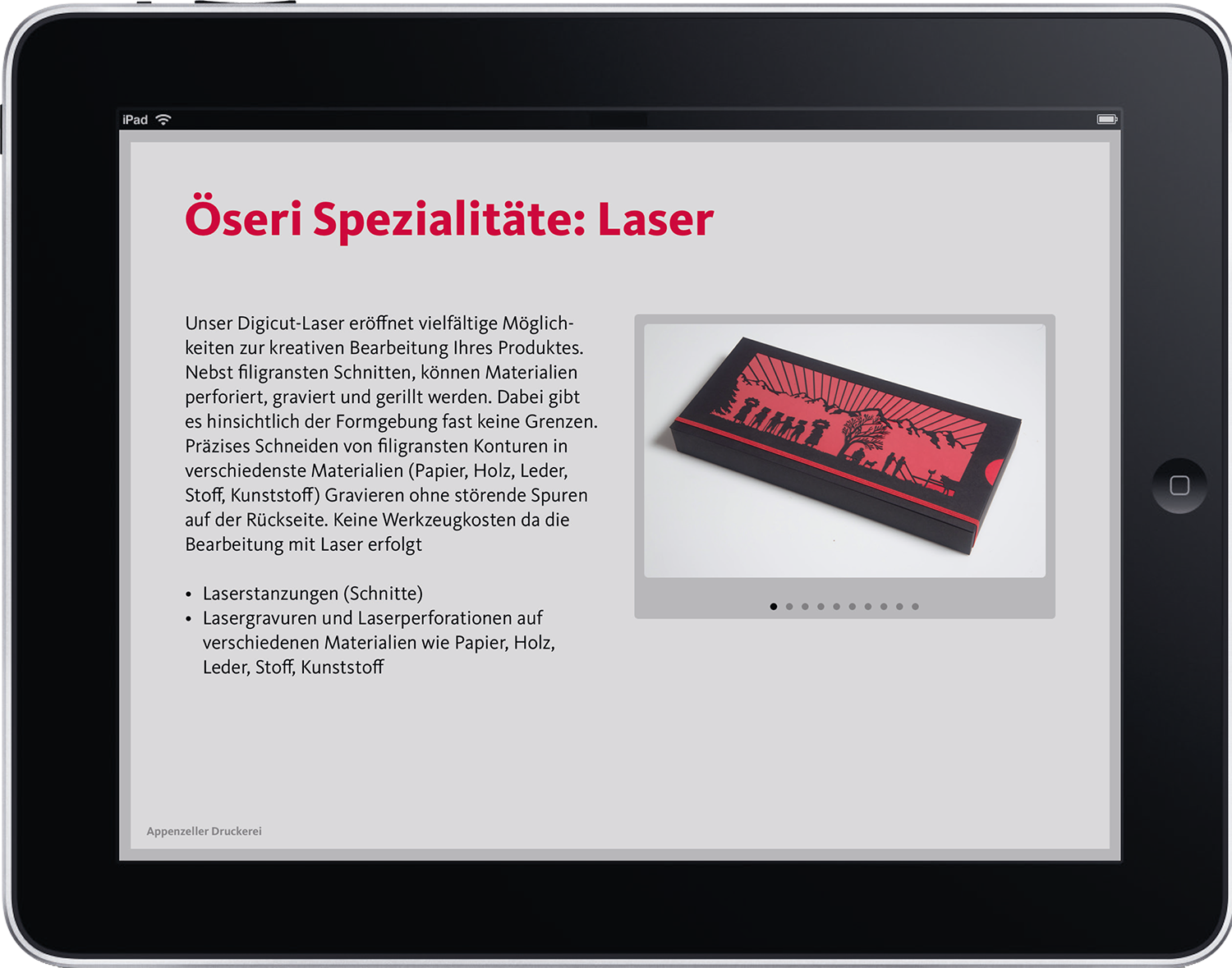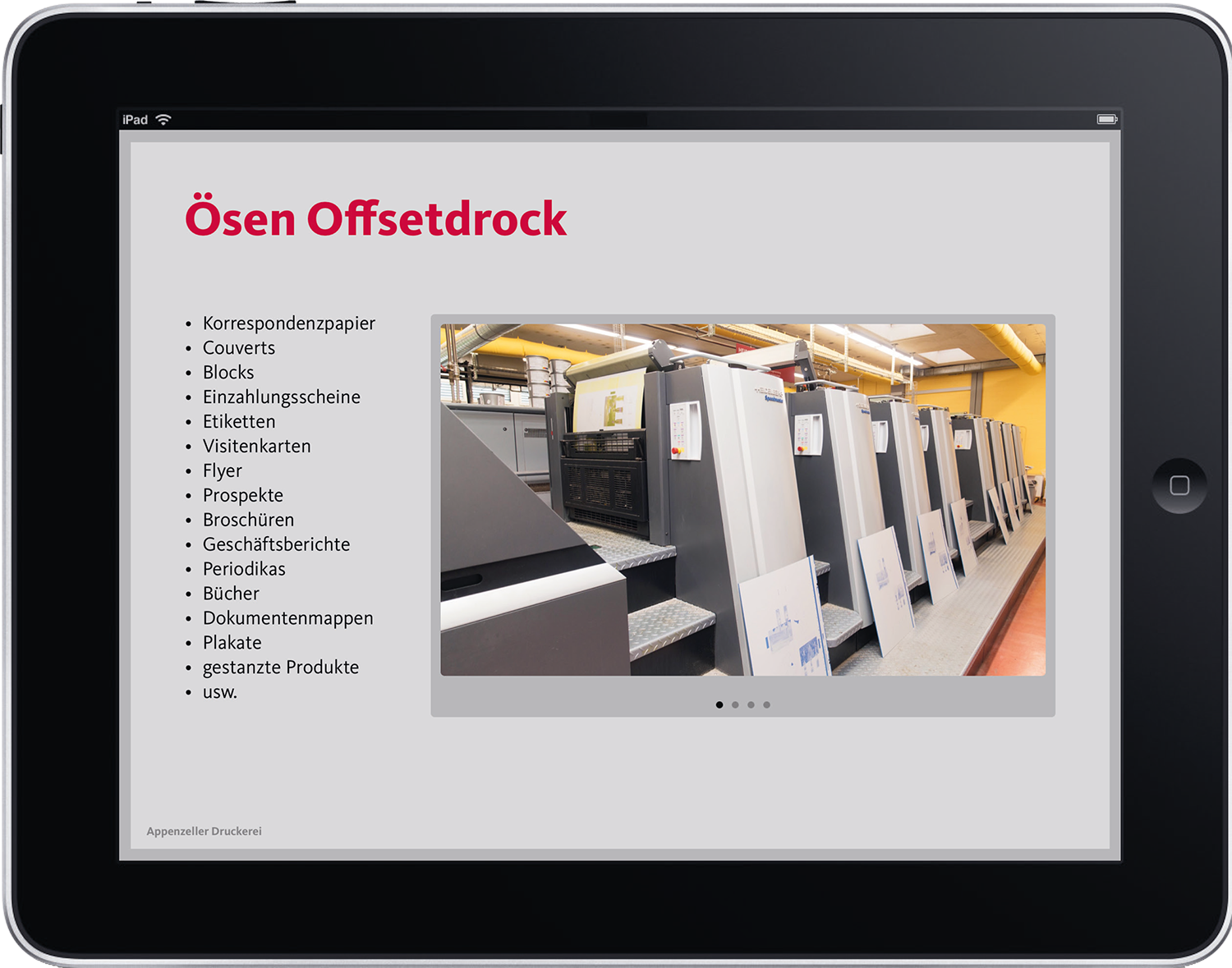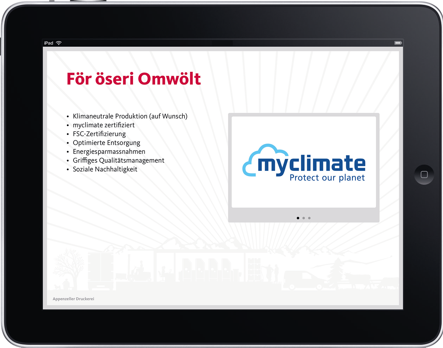 Präsentieren Sie Ihre Firma und Produkte professionell und zeitgemäss auf Ihrem Tablet. Gestalten Sie Ihre Präsentation mit Hilfe von Audio und Video einzigartig und hinterlassen Sie damit einen bleibenden Eindruck.